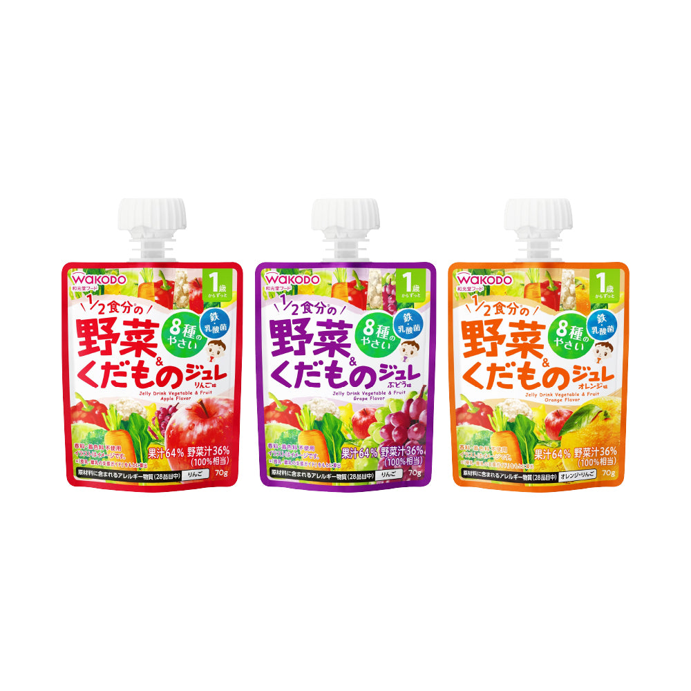 1세 이후 성장기 아이의 균형 잡힌 영양을 위해, 하루 권장량의 1/2 식사분에 해당하는 8종 채소와 3종 과일의 풍부한 영양을 무첨가 젤리 한 팩에 가득 담았어요.